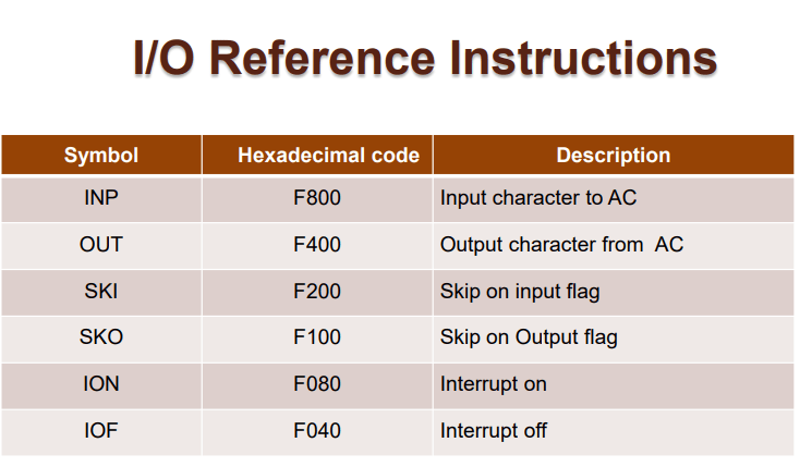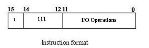 Input/Output – These instructions are for communication between computer and outside environment. The IR(14 – 12) is 111 (differentiates it from memory reference) and IR(15) is 1 (differentiates it from register reference instructions). The rest 12 bits specify I/O operation
